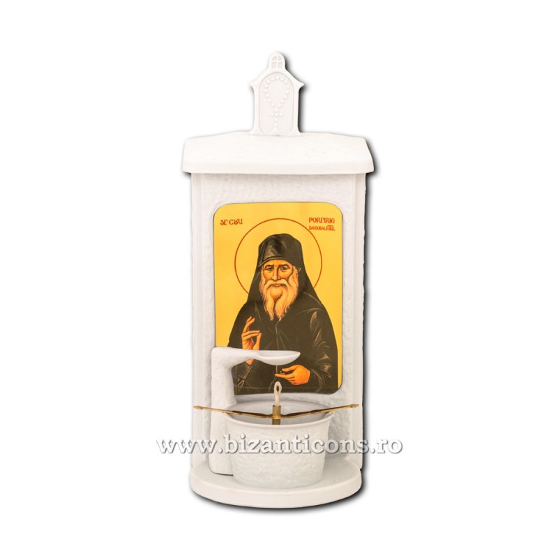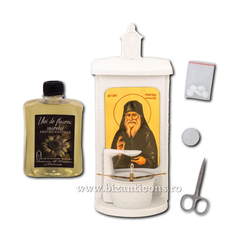 Candela din portelan, punte metal, fitil dim bumbac, suport din portelan pentru ars tamaie, forfecuta pentru intretinere fitil, rezerva ulei, sigilii rezerva ulei si tamaie de la Manastirea Oașa.