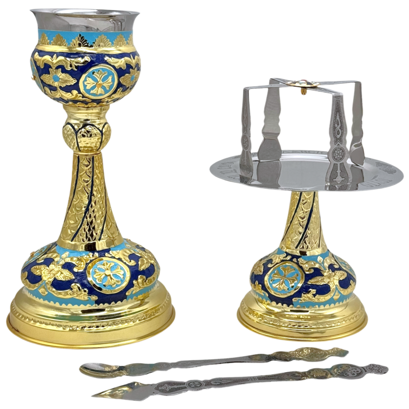 Setul include: Potir cu pahar din inox, Disc, Steluta, Copie si Lingurita