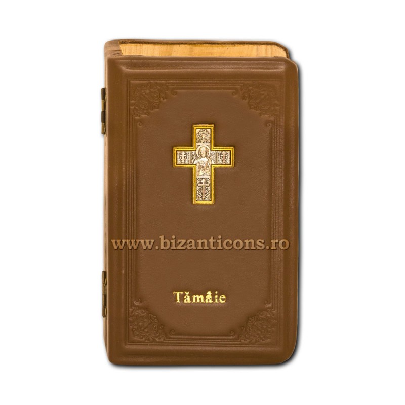 68-304 cutie tamaie lemn - cruce metal - imbracata in piele maro 9.5X4.8X16